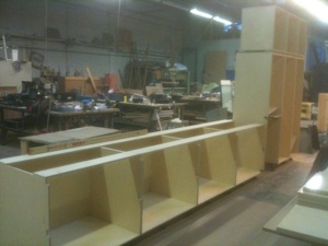 De keuken is gepland in een nieuw te bouwen uitbouw. Hierin heeft Cris de keuken deels laten doorlopen terug de woning in waar de oude keuken stond. Hieronder zijn wat foto’s te zien waarop je een indruk krijgt hoe de keuken , na uitwerking van de ontwerptekening tot werktekeningen, vorm krijgt in de werkplaats.