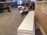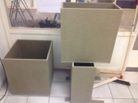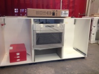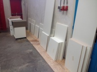 Het geheel met als basis rompen van gemelamineerd mdf . Fronten, deurtjes en nissen gespoten op watervast mdf.
